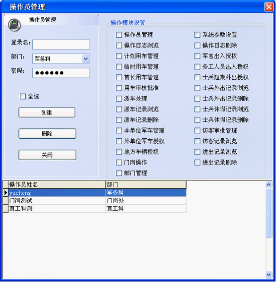 在該頁面下選擇可操作的權(quán)限,以及所屬部門,并輸入操作員名字和密碼點(diǎn)擊”創(chuàng)建”,則完成所有工作。